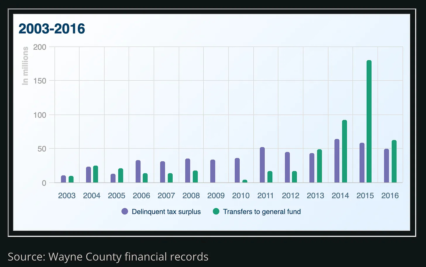 I think the clearest proof that the 18% interest charged on delinquent property taxes is an excessive fine is found in the in the enormous profits counties across the state have reaped from their Delinquent Tax Revolving Funds — none more so than Wayne County.
