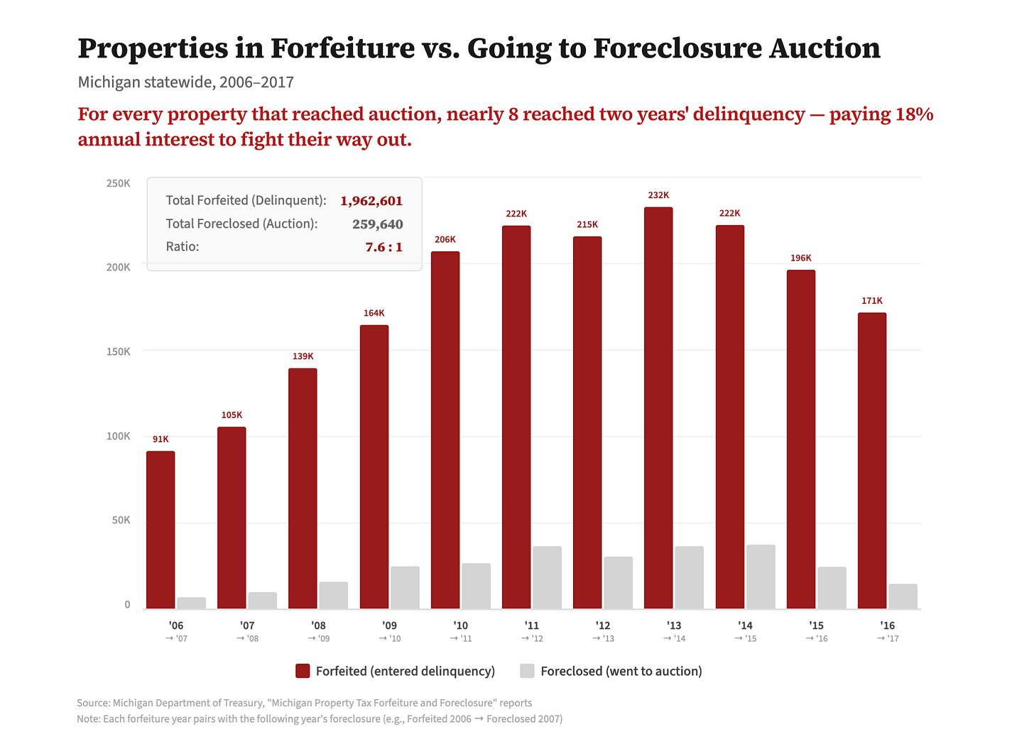 Between 2006 and 2017 — the peak years of the tax foreclosure crisis — for every property in Michigan that actually went into a tax foreclosure auction, eight properties went into “forfeiture” (meaning they’d entered the second year of property tax delinquency). For those seven of eight properties that managed to avoid the foreclosure auction, their owners would have had to pay 18% interest, penalties, and fees to dodge the auction block.1